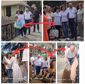 Ներքևի երեք լուսանկարներում նույն շորերով և ճակատին ակնոց կրող տիկինը Նիկոլի տասնյակ թիկնապահների թույլտվությամբ ուղղակի “հետապնդում” է իր կուռքերին. մի լուսանկարում վերին լուսանկարի կնոջ նման, համբուրում է Աննային, իսկ հետո անընդհատ երևում է տեսանյութում հետին պլանում…
